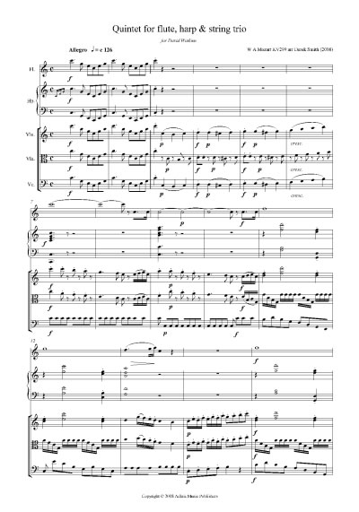 NEWS & REVIEWS Annual Wolfgang Amadeus Mozart Memorial Concert. Kjarvalsstadir, Reykjavik, Iceland 27 January 2009 Derek Smith's Quintet for Flute, Harp & String Trio was performed at this annual concert which marks the birth of WA Mozart on 27 January 1756. The programme also included Divertimento KV 563 for violin, viola and cello, Quartet for flute and strings in C-major KV Anh. 171 (285b). The musicians were Laufey Sigurðardóttir, Þórunn Ósk Marinósdóttir, Sigurður Bjarki Gunnarsson, Martial Nardeau and Elísabet Waage. Clarinet player Einar Jóhannesson talked about the composer and the pieces. “…The best piece was the Quintet in C major which was a world premiere of an arrangment by Derek Smith of the Concerto for flute, harp and orchestra. The arrangement uses 3 string players as an orchestra. They succeded in forming a suiteble frame around Elísabet’s Waage harp playing that was rich of feeling. Here the harp was not drowned as tends to happen with a whole orchestra. No, Derek Smith’s arrangement was both tasteful and inventive, even better than the original!......” Jónas Sen writing in the Icelandic newspaper Morgunbladid. 'Carolingua', Derek Smith's composition for String Quartet and Four Soprano Voices, was awarded first prize in the Henschel String Quartet / BBC Music Magazine's Henschel String Quartet competition 2009. It is to be featured on a CD of Christmas music with the Henschel Quartet and the famous Toelzer Knabenchor. Mozart’s Flute & Harp “Quintet” Composed in Paris in April 1778, Mozart's Concerto was written for Adrien-Louis de Bonnières, Duc de Guines, and his harpist daughter, Marie-Louise Philippine, who was Mozart's composition student. It features the then new multi-keyed flute with extended register down to D flat and C natural, exploited gleefully in the first movement, the bottom ‘C’ also appearing in the other movements. Though popular with audiences, the work is expensive to put on and in some resonant acoustics there can be balance problems. The nineteenth-century chamber literature contains a number of attractive French works for flute, harp & solo strings. This gave me the idea of arranging the Concerto as a companion piece for intimate performance. In order to realise a true chamber music
